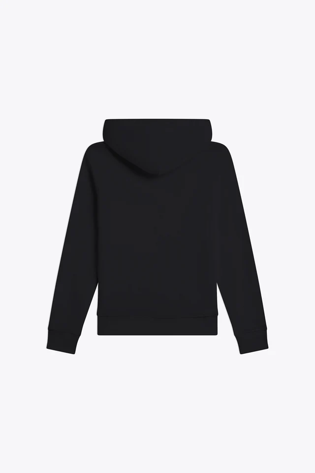 Coupe standard, coupé cousu, fermeture à glissière devant, capuche avec cordon embout métallique, bas des manches et du buste en bord cote 2×2, poche ventrale avec détail tricolore pincé poche gauche.